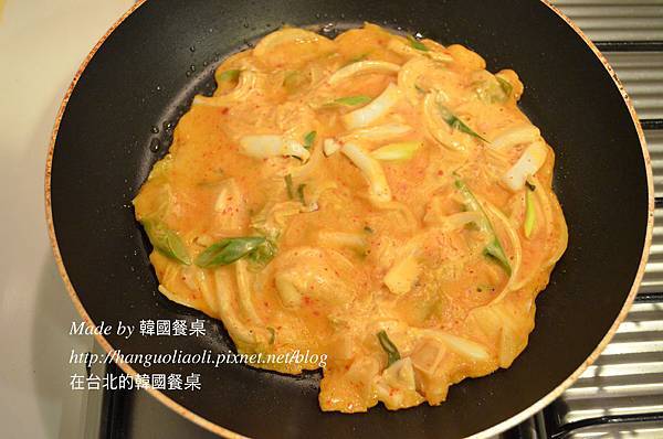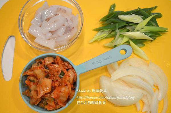 主材料: 半杯切好的泡菜 1/2杯、魷魚 1/2、洋蔥 1/4、蔥 40 cm